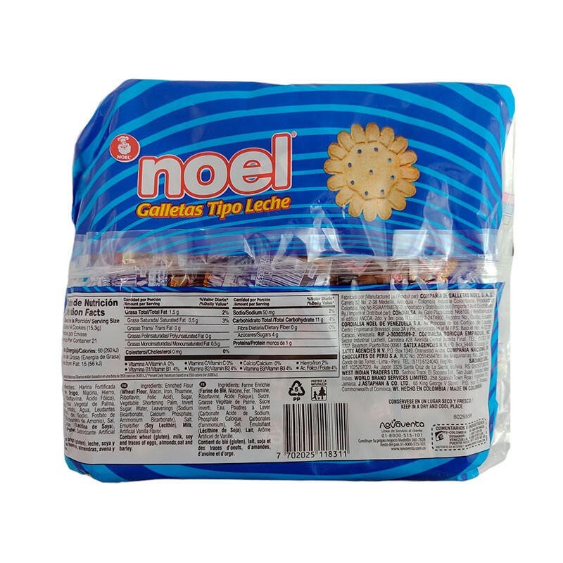 Las galletas Noel Tipo Leche son galletas suaves y dulces, con un ligero sabor a leche que encanta tanto a grandes como a pequeños. Estas galletas son ideales para consumir solas, acompañadas de café, leche o té, y también son excelentes como base en una variedad de postres. Su textura y sabor clásico las convierten en un producto versátil y delicioso para cualquier momento del día.